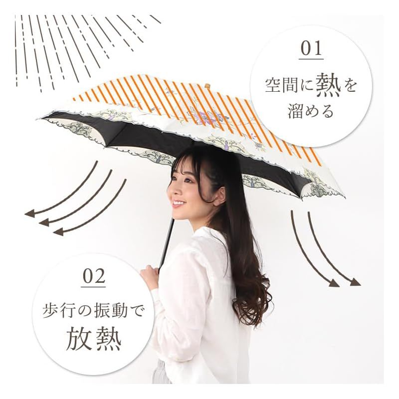 ◆高級傘のみに使用されてきた「かわず(蛙張り)=特殊2重張り製法」を用い2重張り部分で、温められた空気を「貯めて逃す」ことにより、太陽光も暑さもシャットアウトする卓越した機能=[逃熱]を備えた2段折りたたみ日傘。