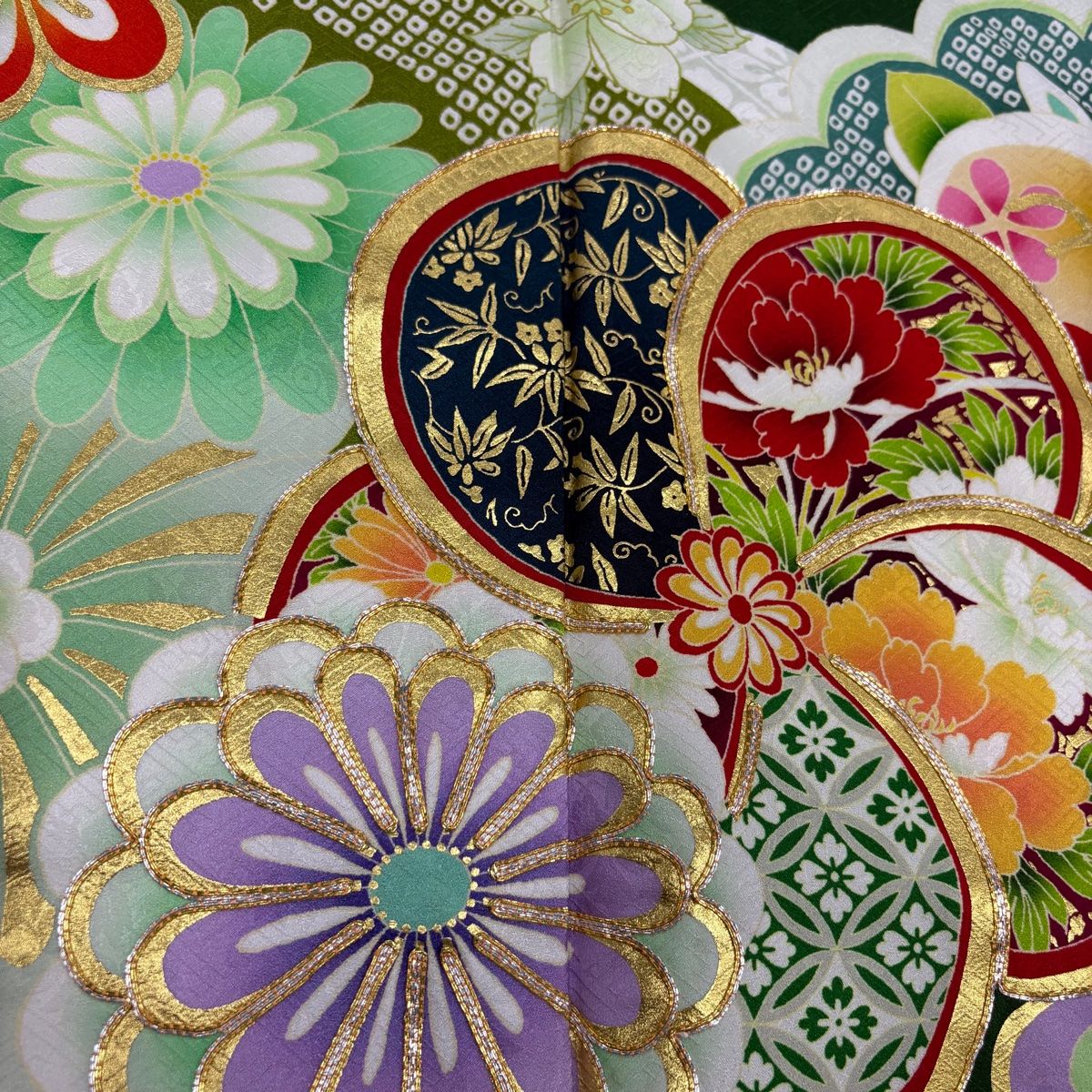 振袖 身丈175 cm 裄丈69 L 袷 ねじ梅 菊 金銀糸 金彩 深緑 正絹