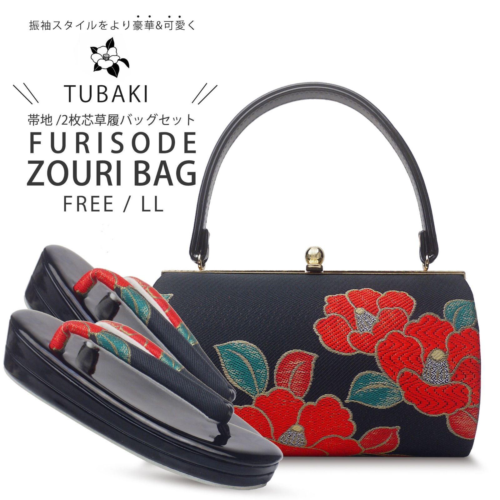 椿 黒 草履バッグ セット 赤×黒 帯地 二枚芯の草履 選べる 振袖 訪問着 留袖 色無地 銀 シルバー 金 ゴールド 赤 フリーサイズ LLサイズ