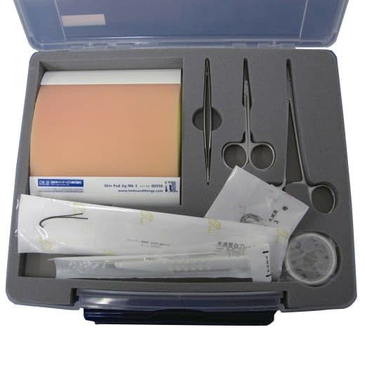 ●構成品:縫合パッドPro(L)、スキンパッド保持枠Mk3、へガール持針器(16cm)、眼科剪刀(両尖12cm)、外科ピンセット(有鈎)、3号外科強弯角針×5本、3-0絹製縫合糸40cm×10本・20m巻×1コ、スカルペルNo.11、収納ケース