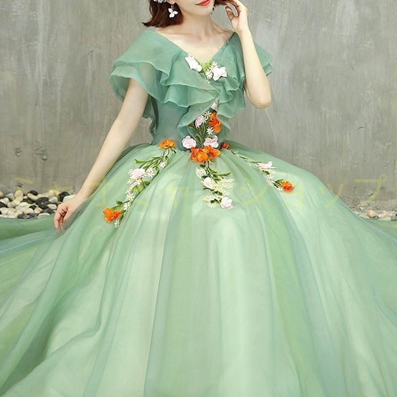 ドレス 編み上げ グリーン 半袖 緑 ロングドレス 結婚式 二次会 発表会 演奏会 ウェディングドレス ウエディングドレス 花嫁 前撮り プリンセスドレス シフォン ふんわり 1328