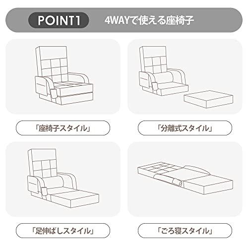 アピール情報: 【4wayで使える座椅子】シーンや体勢に合わせて座椅子の形を変えられます。 【安心の日本製ギア、14段階調節可能】背もたれ部分にKoYo製の14段階ギアを採用します。 【肘掛け付きでより快適】肘掛けにクッションがたっぷり。 【小物収納設計】片側に収納袋とカップバッグが付きます。 【ファブリック生地】ファブリック素材を使用していて一年中快適に使えます。 【高品質な座り心地】厚さ約20cmの座面で、体圧をバランスよく分散させることで体にフィットできます。 【移動楽々】女一人でも簡単に運べます。 【折りたたむと、よりコンパクトに】折りたたむとコンパクトにまとめられます。 【クッション×1付き】本体と同色のクッションが付属します。