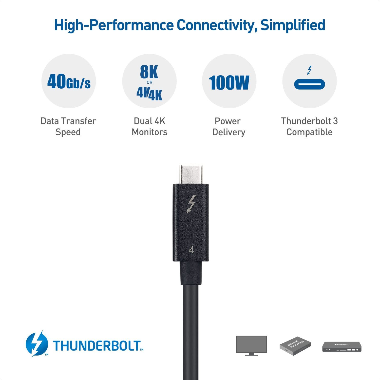 【Thunderbolt 3ポートと下位互換】Thunderbolt 4は、Thunderbolt 3における革新をもとに構築され、真にユニバーサルなケーブル接続体験を実現するもので、ケーブル一本で40 Gbpsの転送速度で、データやビデオ転送、電力供給を行います。Thunderbolt4ケーブルはThunderbolt 3ケーブル規格およびThunderbolt3デバイスとホストとの完全な下位互換性を備えています。