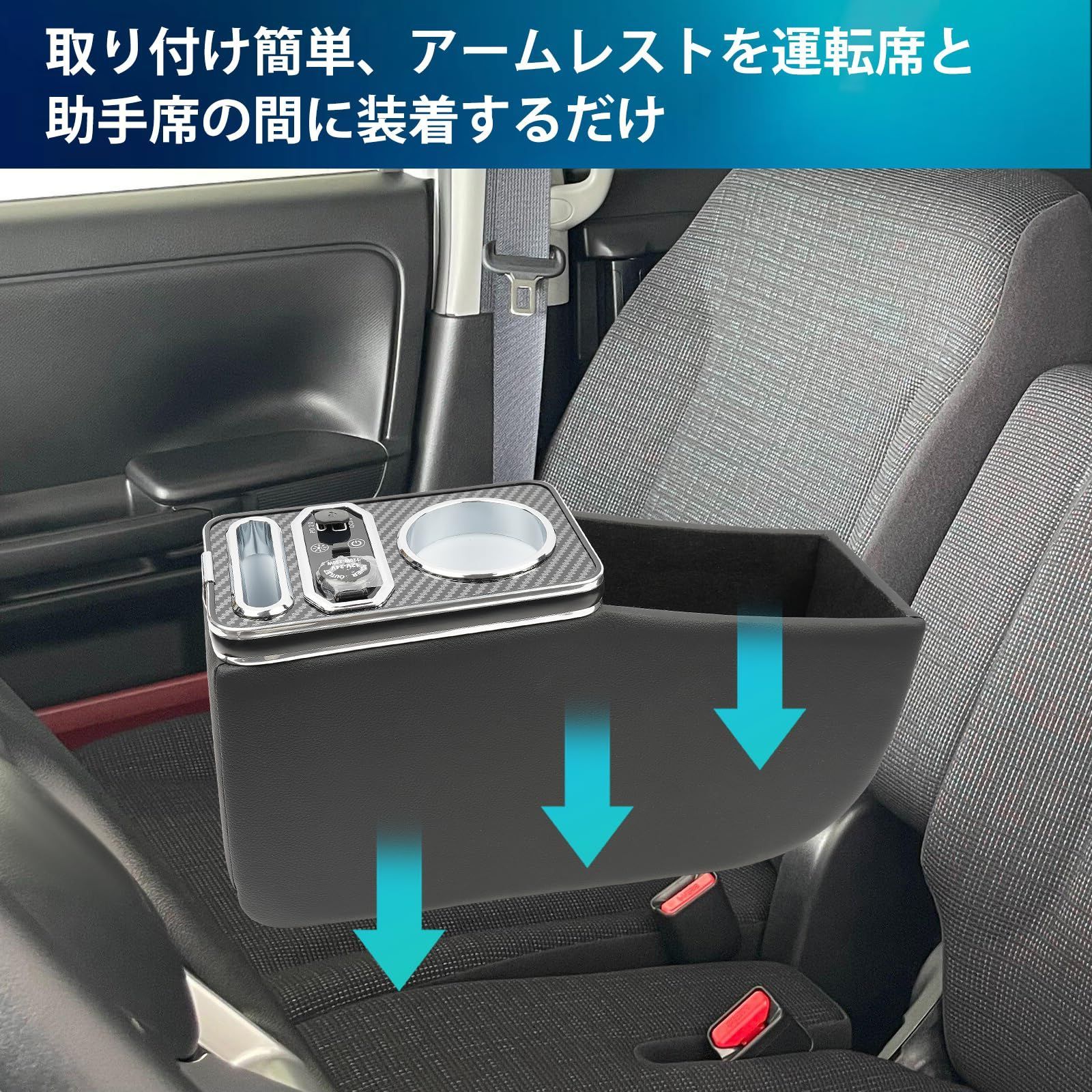 【大容量収納スペース】スペーシア専用の明るさ調節&7色変化アームレストは、運転席と助手席の間のスペースを効率的に活用し、車内をよりスッキリと整理できます。スマートフォンやドリンクを収納するための専用スペースを備えております。さらに、横部分にはコインやスマートフォンなどの小物を整理できる設計となっています。