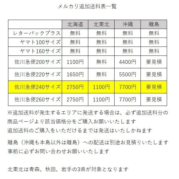 該当エリアへの配送は必ず送料表ページより追加送料をご購入の上、商品ご購入をお願いいたします。