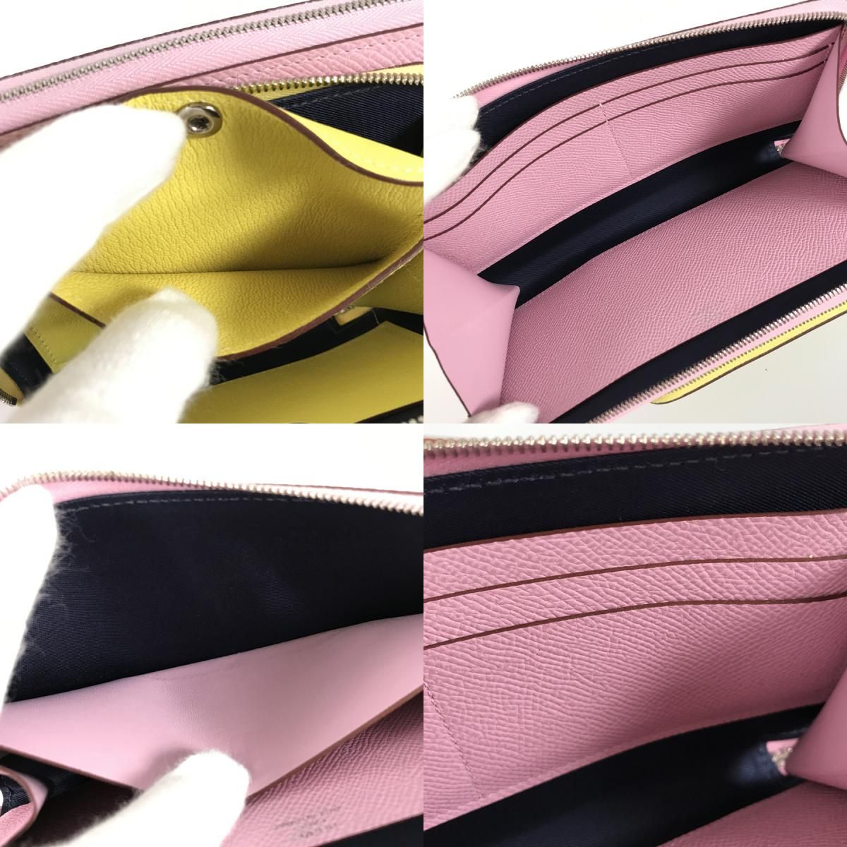 全体:ピンクのレザーの外側の底面に僅かな薄汚れがございます。ファスナー周りに若干の毛羽立ちがございます。ジッパープルに反りがございます。黄色いレザーの内側のカードポケットの上辺りに薄汚れがございます。その他は綺麗な状態でございます。