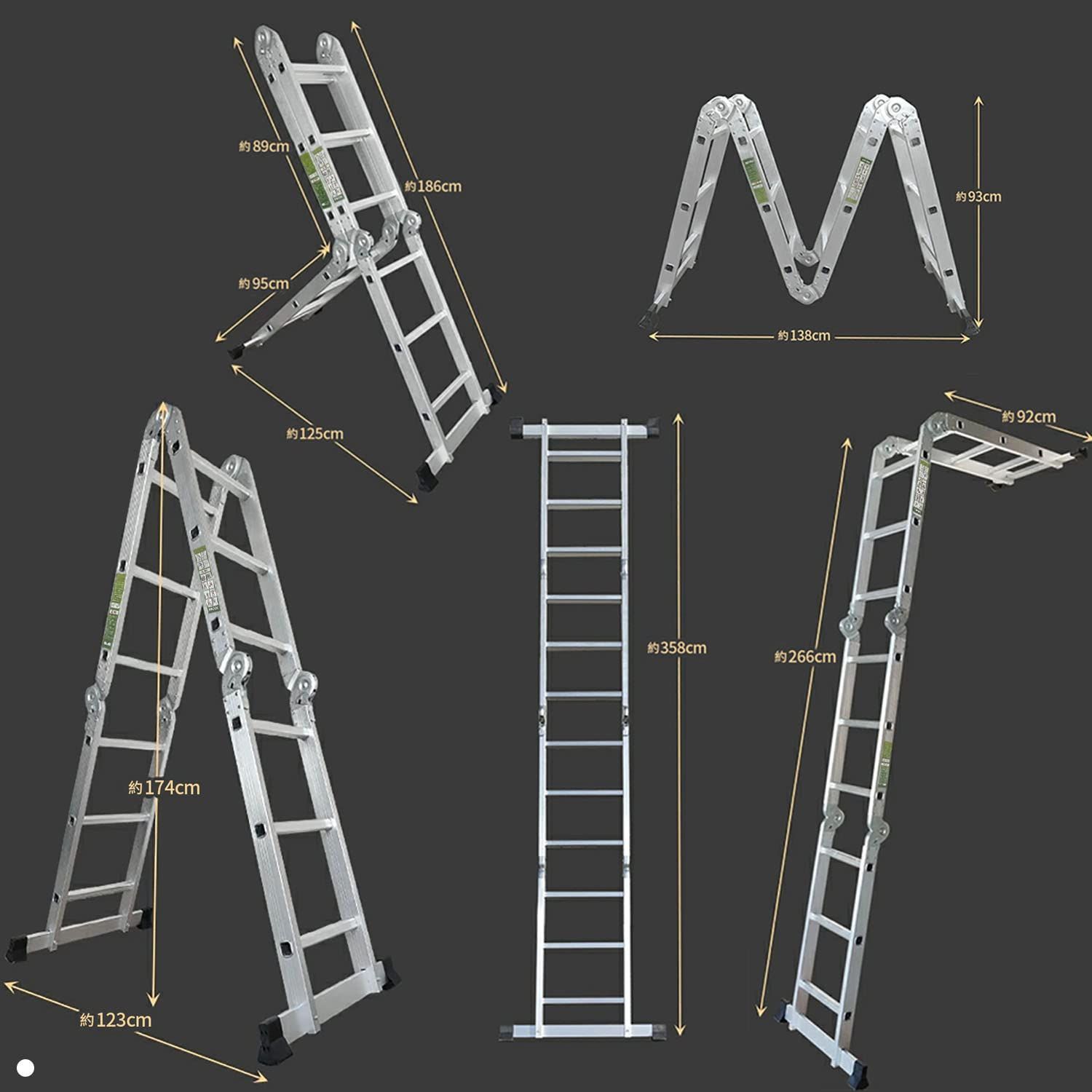 【多機能】1台5役で使えます。М字型・7字型・脚立などの型があり、使用場所により使い分けができます。【安定感抜群】便利・安心のワンタッチロック機構です。低部には地面をしっかり捉える横倒れ防止用の足が付いているので、安全に作業ができます。【収納便利】伸縮可能なはしごは、折り重ねると小さくなれます。これによって、車のトランクに入れることができます。家の片隅にも収容できます。