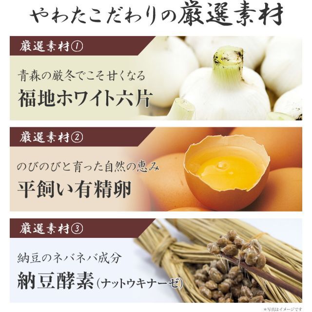 南九州に伝わる伝統食「にんにく卵黄」に、今注目の納豆酵素「ナットウキナーゼ」を加えました。原材料にもこだわり、品質のよい青森県のにんにくと、新鮮な有精卵をぜいたくに使用しています。