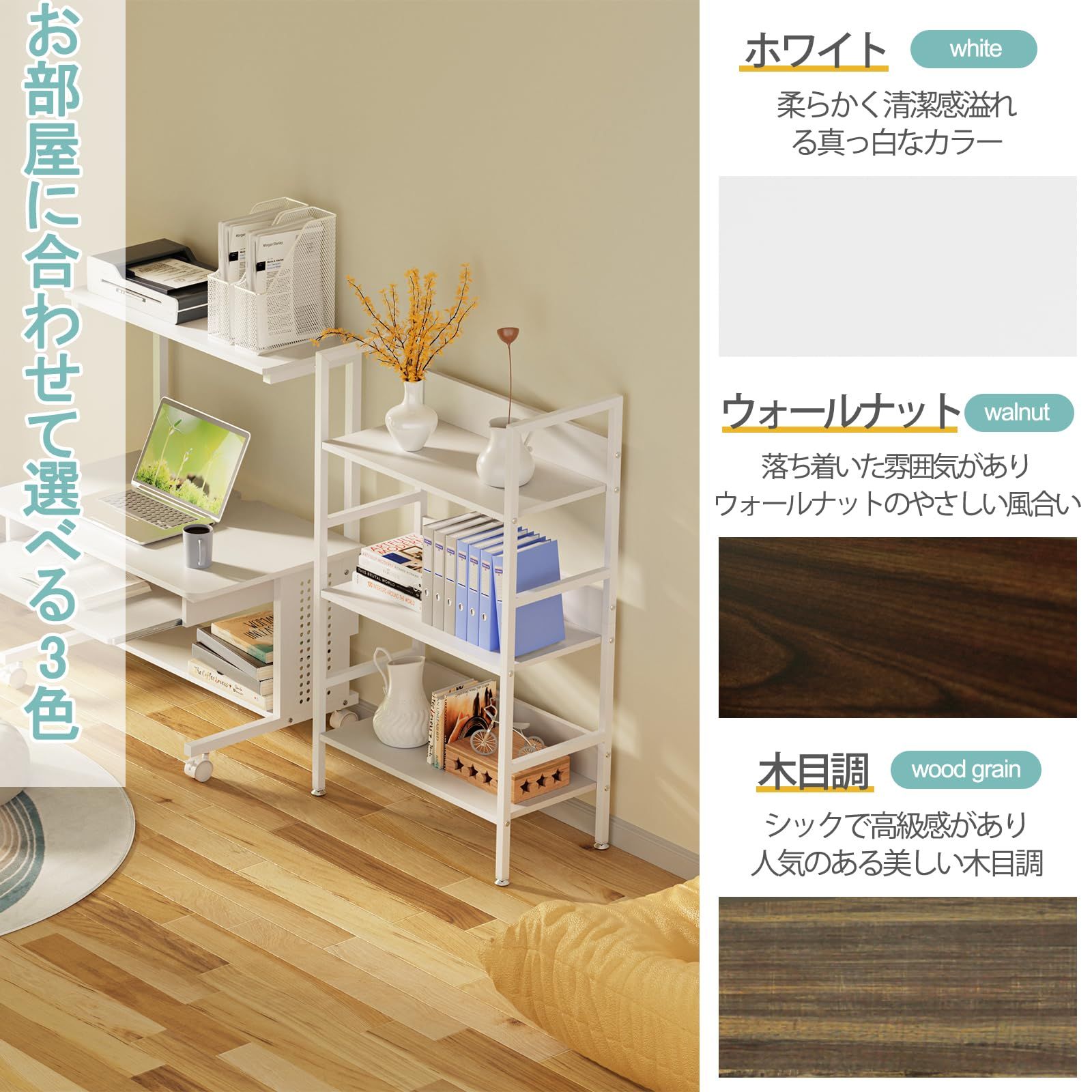 【縦の空間を有効活用】★上棚:上棚スペースにはインクジェットプリンタなどのパソコン周辺機器を置くことができます。体格やモニタの高さに合わせて、5センチ間隔で3段階調節可能です。手を伸ばせば使いたいものにすぐ届く便利な上棚です。★天板:パソコン操作に十分な広さ、ゆったり快適に使えます。★下棚:パソコン本体やルーター、書類を収納でき、足元のスペースを有効活用できます。★キーボードスライダー:キーボードや小物を置けます。スリムなのに収納力が抜群で場所が取らないです。ちょっとしたスペースがパソコンコーナーに早変わり、作業効率がぐんぐん上がります。ご自宅ではもちろん、オフィスでも大活躍!