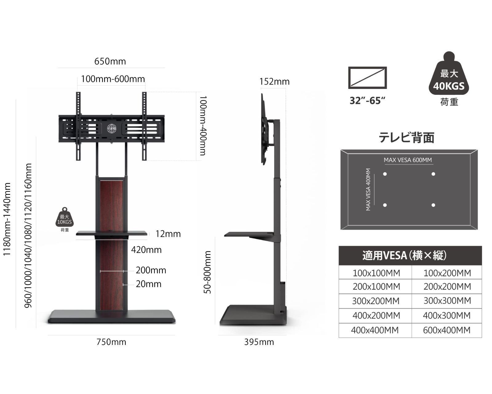 ??【商品仕様】本体サイズ:幅750mm×奥行395mm×高さ1180~1440mm、底板サイズ:750×395mm、梱包重量:約18.4kg、耐荷重:ラック/40kg、対応VESA規格:100mm x100mm~600mm x400mm、対応テレビサイズ:32~65インチ