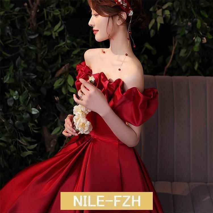 イブニングドレス オフショルダー サテンドレス ワイン赤 ゲストドレス 結婚式ドレス 二次会ドレス ワインレッド ロングドレス 発表会ドレWP数量 価格926