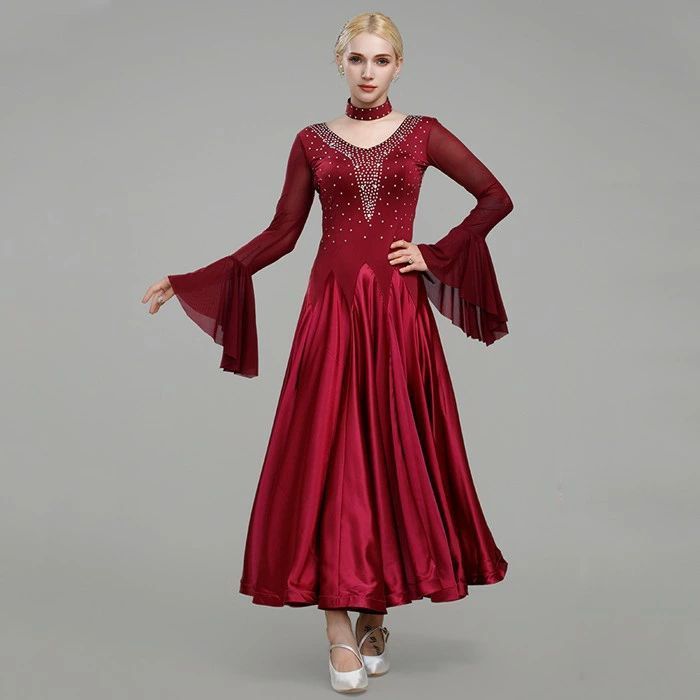 社交ダンス ドレス 社交ダンス衣装 ワンピース 初心者 長袖 スタンダードドレス ルンバ スタンダード パープル 発表会 競技着 練習着 演出用 ワルツ 広がる裾 ブラック レッド ワ