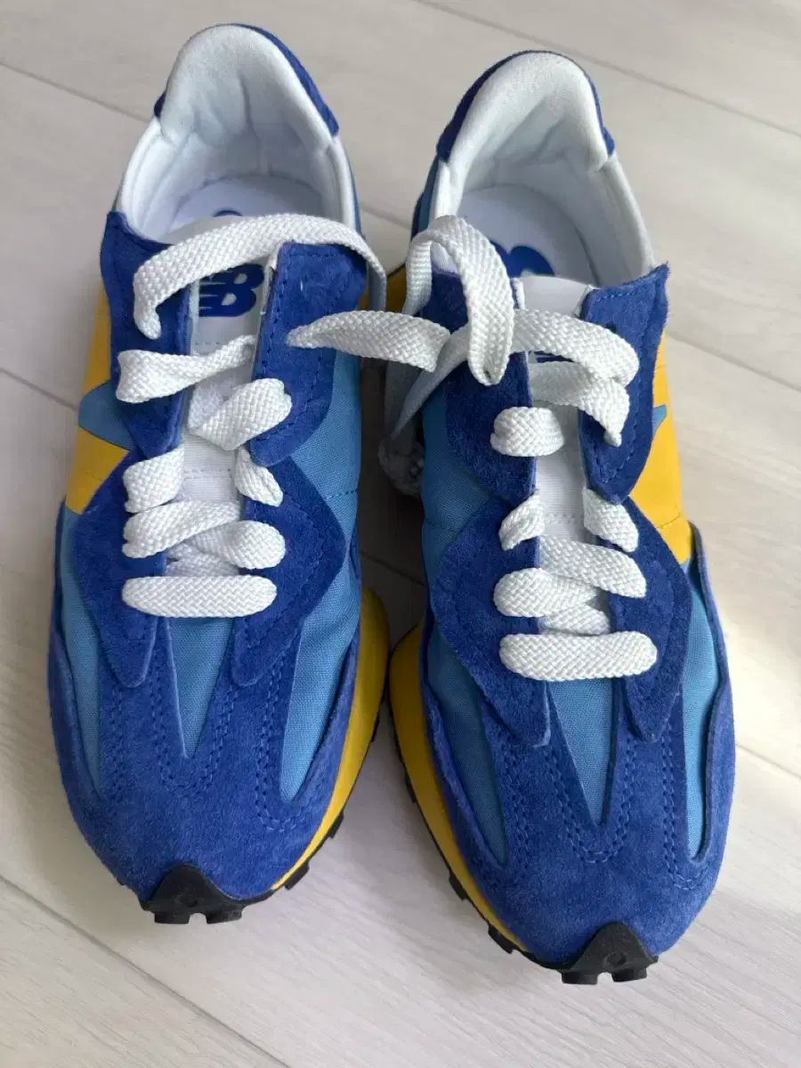ニューバランス 327 ブルー/イェロー 250サイズ 新品です。実物깡패のきれいな色合いを誇るスニーカーです。どんなスタイルにもよく似合うデザインなので、活用度が高いと思います。