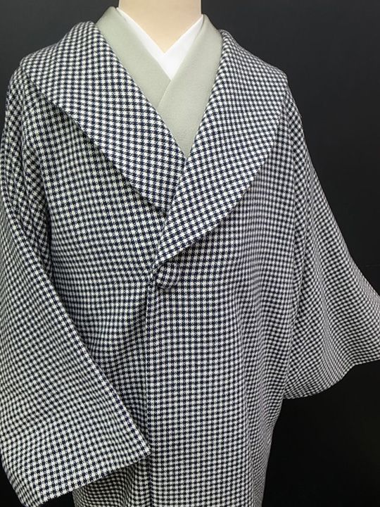 防寒コート 和装コート 羊毛100% へちま衿 市松 カジュアル 黒 g 024