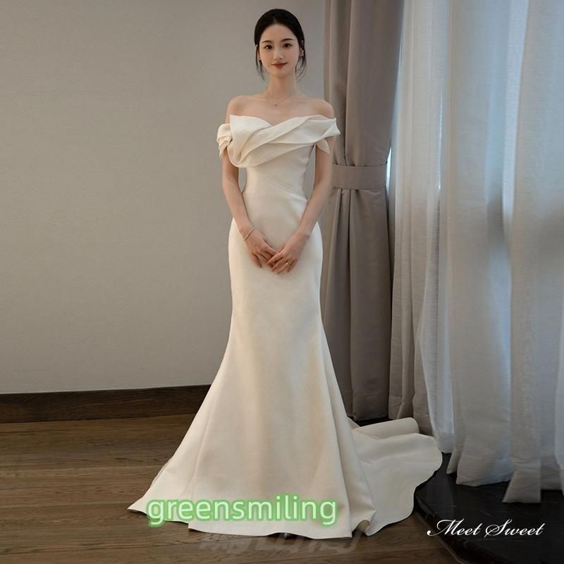 ウェディングドレス ウエディングドレス ロングドレス 二次会 結婚式 前撮り ブライダル 花嫁 オフショルダー ファスナー サテン トレーン WP数量限定価格926