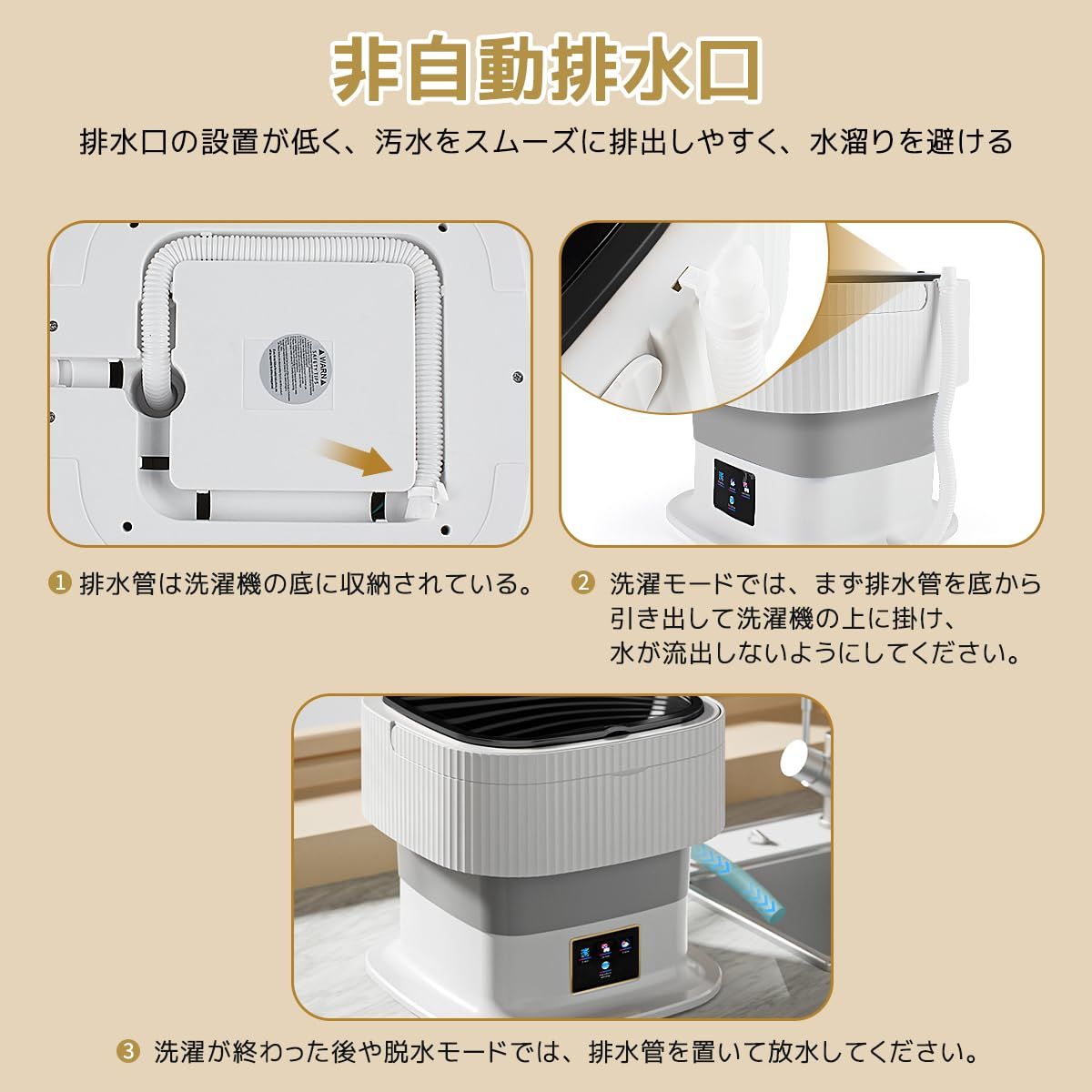 特徴 省エネ・節水、排水ホースと水切りカゴ付き、3段階機能
