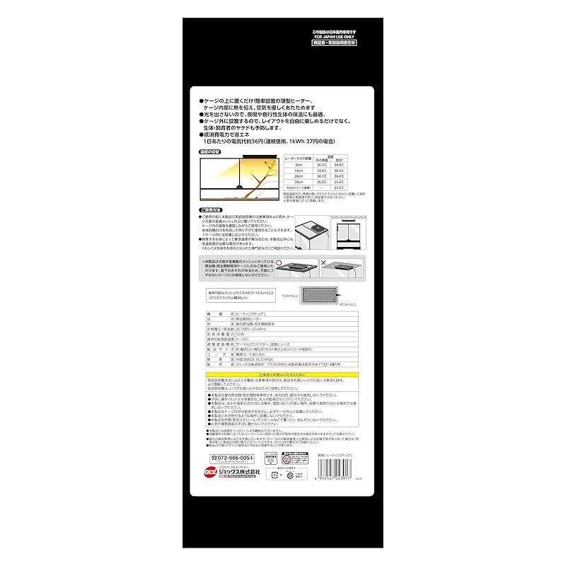●光を出さないので、夜間や夜行性生体の保温にも最適。 ●ケージ外に設置するので、レイアウトを自由に楽しめるだけでなく、生体・飼育者のヤケドも予防します。 ●低消費電力で省エネ 1日あたりの電気代約36円(連続使用、1kWh=27円の場合)