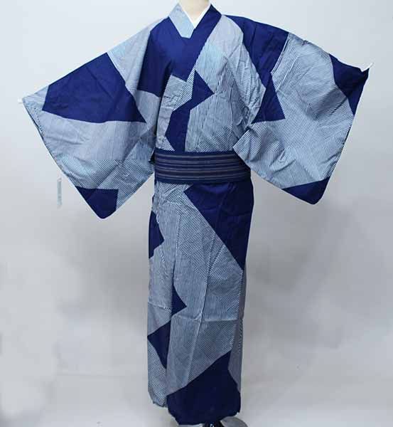 浴衣 帯 下駄 信玄袋 腰紐2本 6点フルセット 男性用 Lサイズ 綿100% 黒の縞に紺の三角模様 NO 40179-2