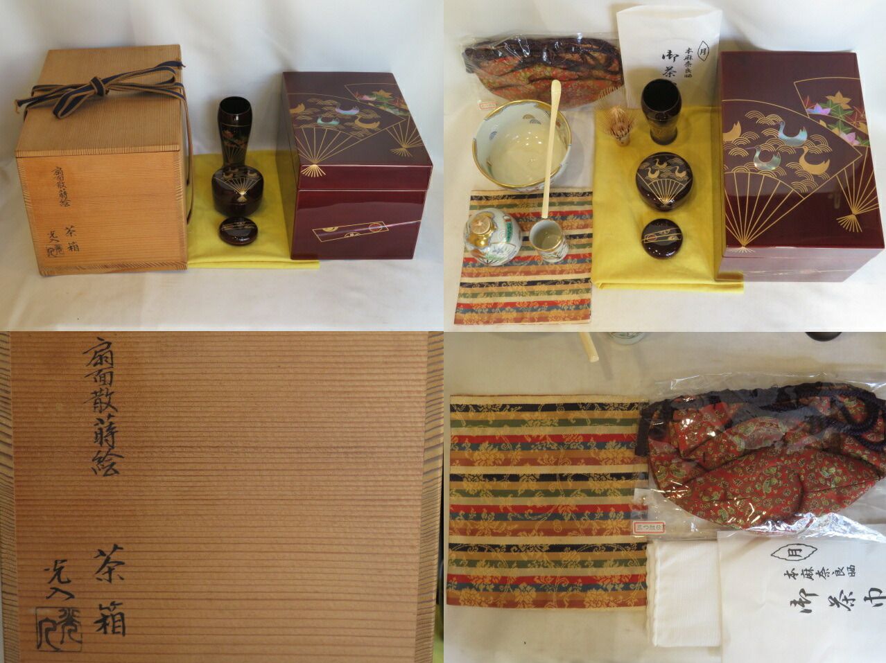 九月 特売品 平安 鈴木光入作 扇面散蒔絵 茶箱セット 上茶杓 三点仕覆 手塚央作 茶碗三点セット 振出 巾筒 棗 茶道具 税込