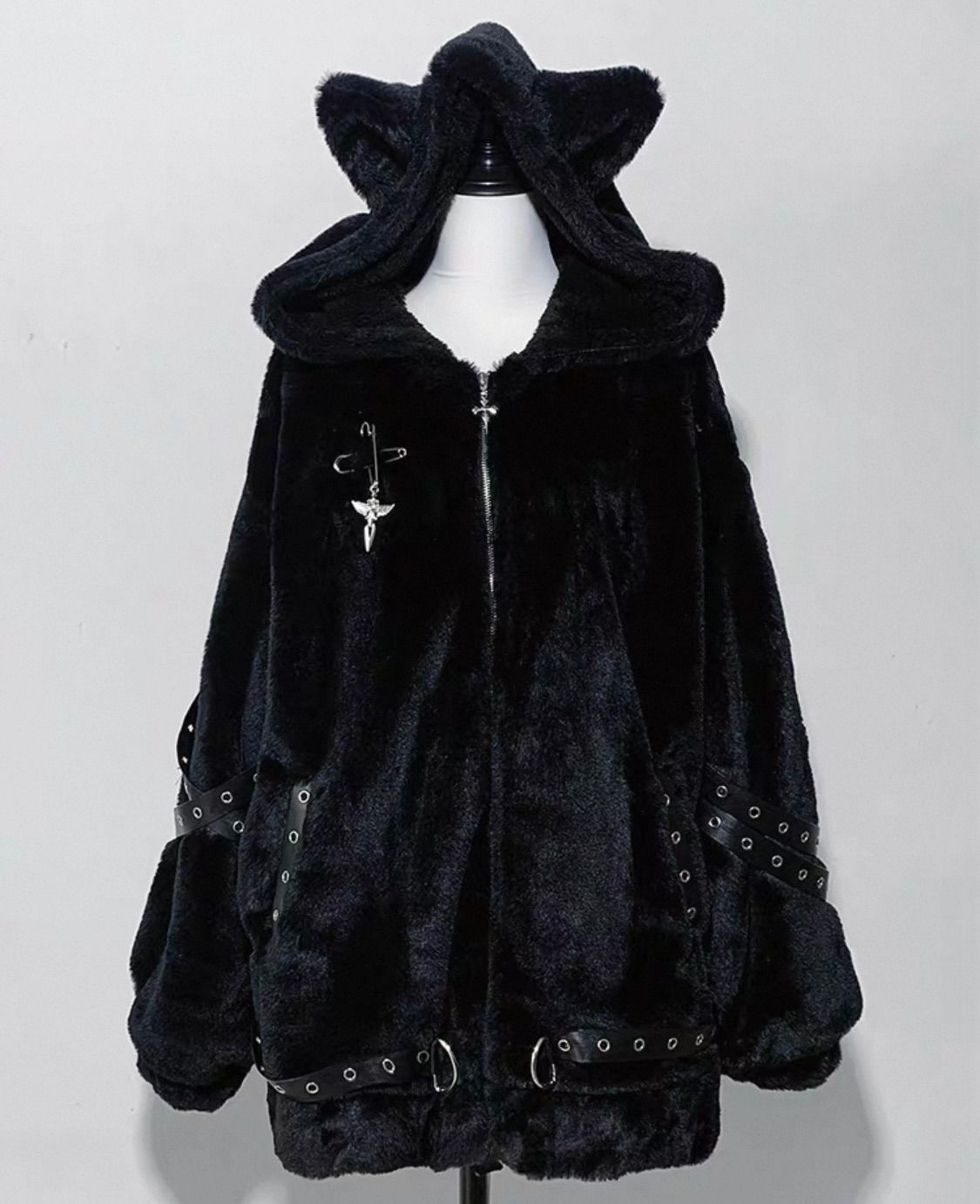 もこもこ アウター パーカー フード 耳付き 地雷系 韓国ファッション 量産型 モノトーン かわいい ブラック ホワイト 秋冬 レディース ジップアップ コート ふわふわ ジャケット 大きめ 体型カバー