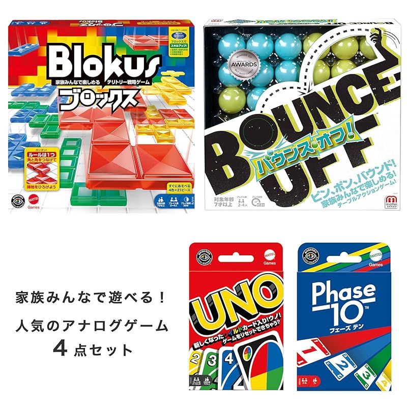 【内容】家族みんなで遊べる人気のアナログゲーム計4点がセットに! 世界中で大人気のボードゲーム”ブロックス” シンプルだけどクセになる!”バウンスオフ” カードゲームの大定番”ウノ” アメリカで年間100万個以上売れているゲームがついに日本上陸!”フェーズテン” 家族や仲間とみんなでワイワイ楽しもう!
