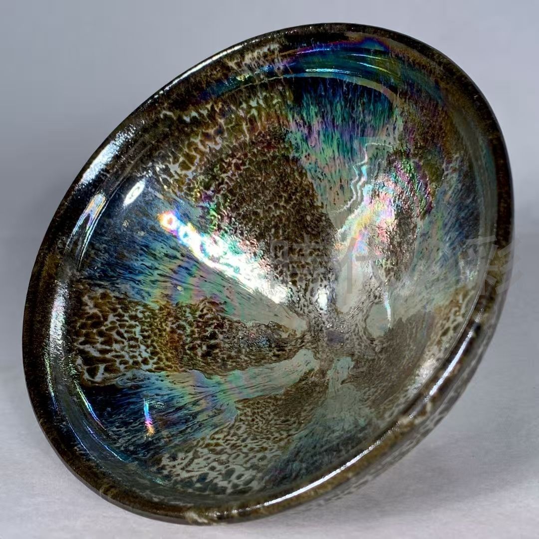 宋代建窯の曜変天目盞で、七彩の蛇皮文が現れた非常に珍しい作品です。窯変による幻想的な景色は宋代陶磁の粋を示しています。茶碗としても飾り物としても価値が高く、愛好家必見の逸品です。経年変化はありますが、良好に保存されています。