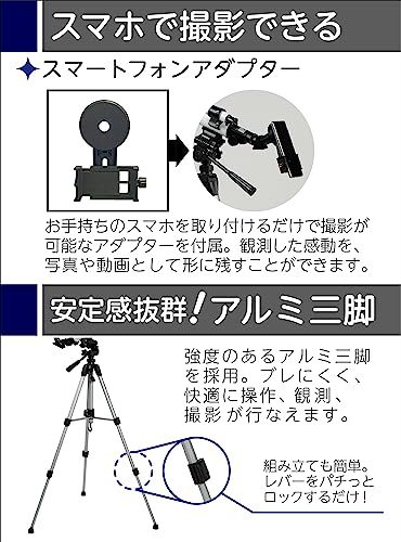 付属品: アルミ三脚、アイピースx3(4mm / 12.5mm / 20mm)、5x24ファインダー、天体観測用天頂ミラー、地上観察用正立プリズム、スマートフォンアダプター、天体ガイドブック、取扱説明書、星座早見盤