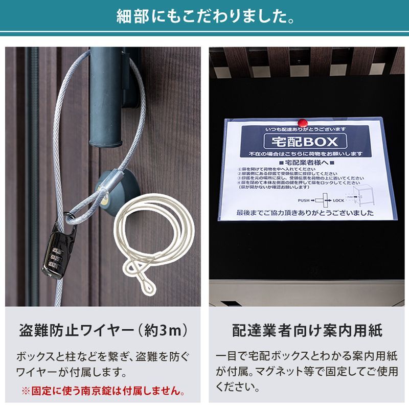 専用の鍵と盗難防止ワイヤーが付属し、留守中も配達物をしっかり守ります。