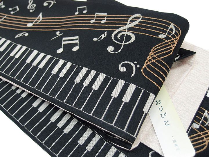 鍵盤と楽譜の柄と矢羽根を織り上げた、