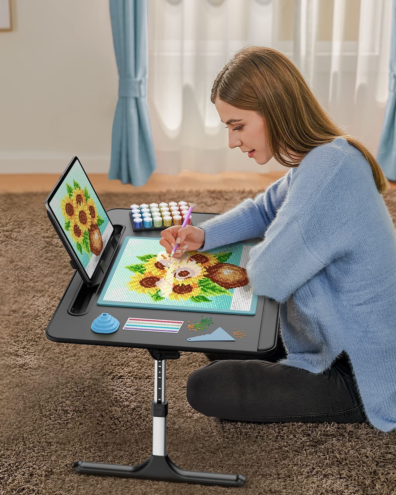 【角度と高さが調節可能なベッドテーブル】SAIJIのベッドテーブルなら、角度や高さを調整して、目や背中、首に負担をかけずに作業できます。両側にあるオートロックボタンで高さを簡単に変えられて、高さは5段階(25-35cm)に設定できます。また、天板の角度も、クランプを使って4つの異なる角度(0°-36°)に変更できます。