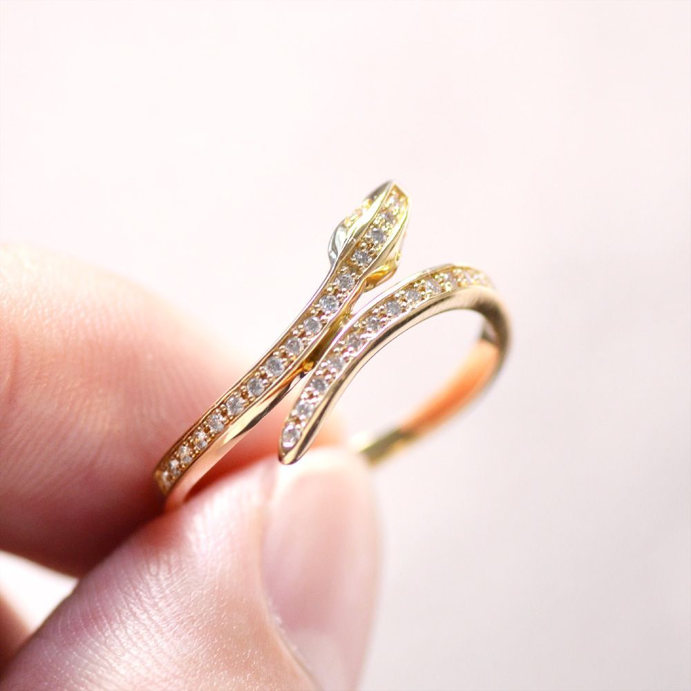 蛇をモチーフにしたダイヤモンドリングです。蛇らしい曲線を描いた上品なフォルム。細身のアームにぎっしりと敷き詰めたダイヤモンドが際立ちます。両目にもセットしたダイヤモンドは全て無色透明で良質な輝きの良いルースだけを厳選。ご注文をお受けしてから職人が手作業でお造り致します。女性にもお勧めのジェンダーレスなリングです。