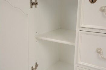 エレガントな彫刻が施された引出しつきアンティーク風キャビネット。