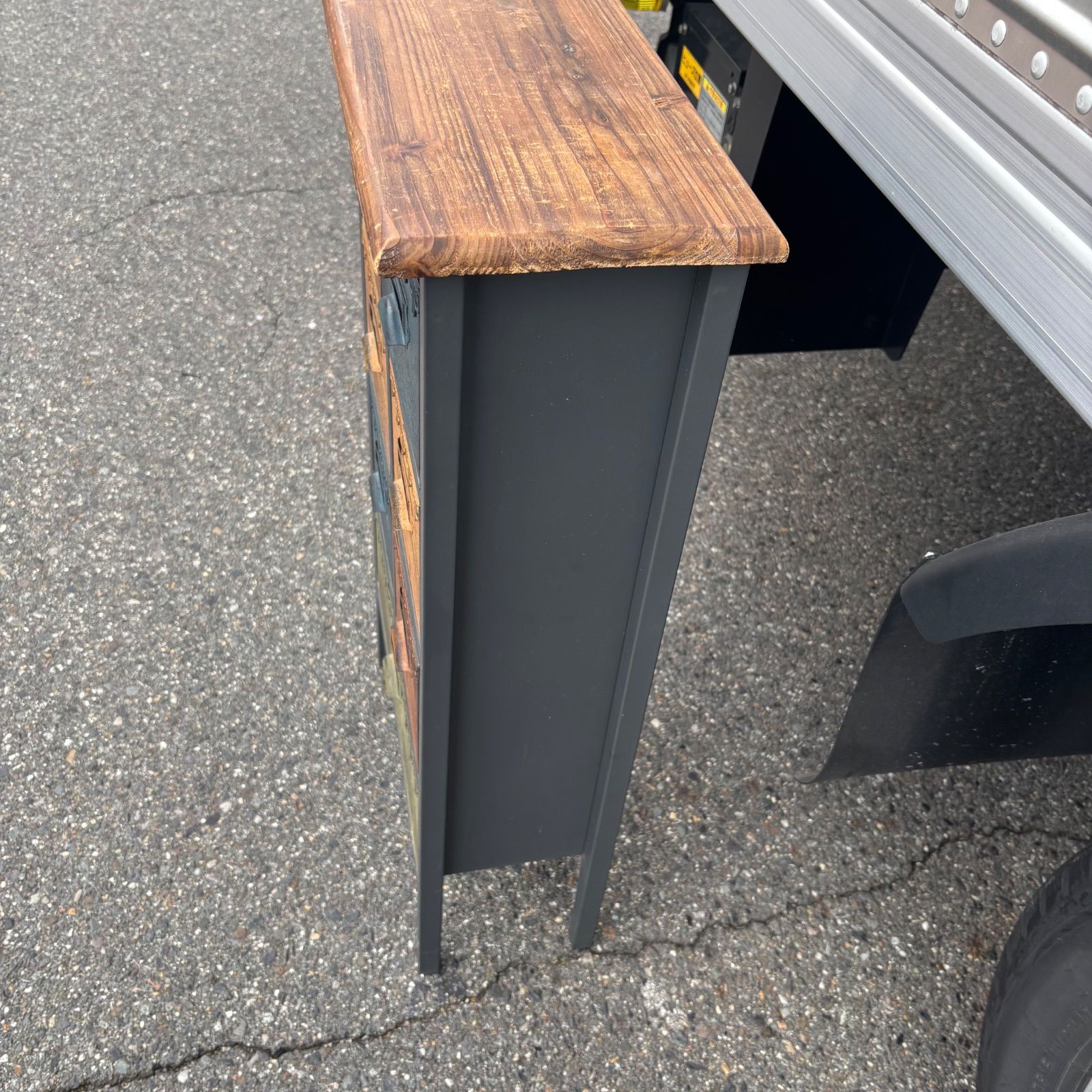ヴィンテージ風の加工が施されており、購入時からの塗装の剥がれや錆のようなデザインがあります。