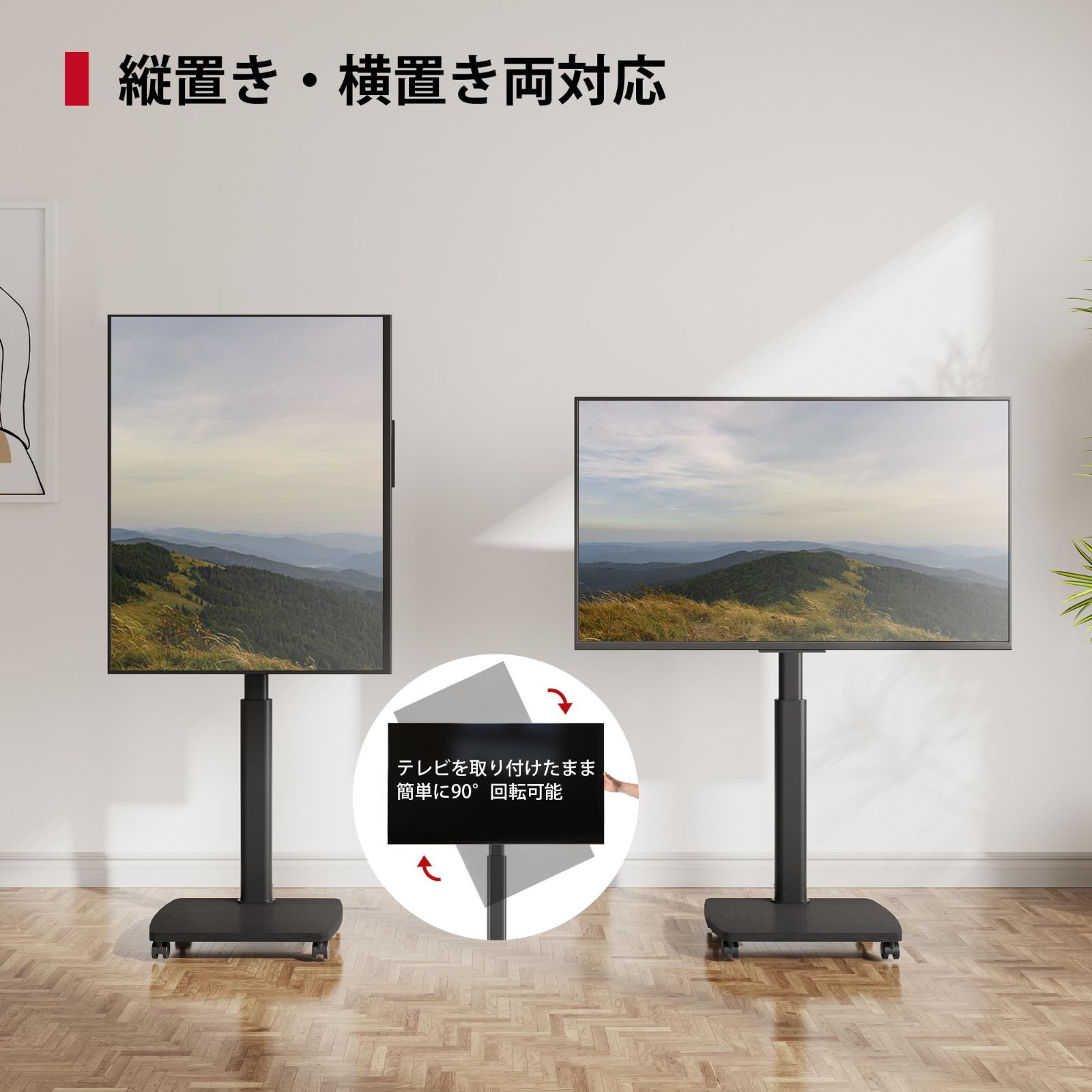 【横・縦置き】壁寄せテレビスタンドは工具いらず、テレビを取り付けたまま90°回転可能です。首振は左右に35°調整可能です。チルト機能もあり、下方向に2度、上方向に10度です。さまざまな角度からテレビを見ることができます。