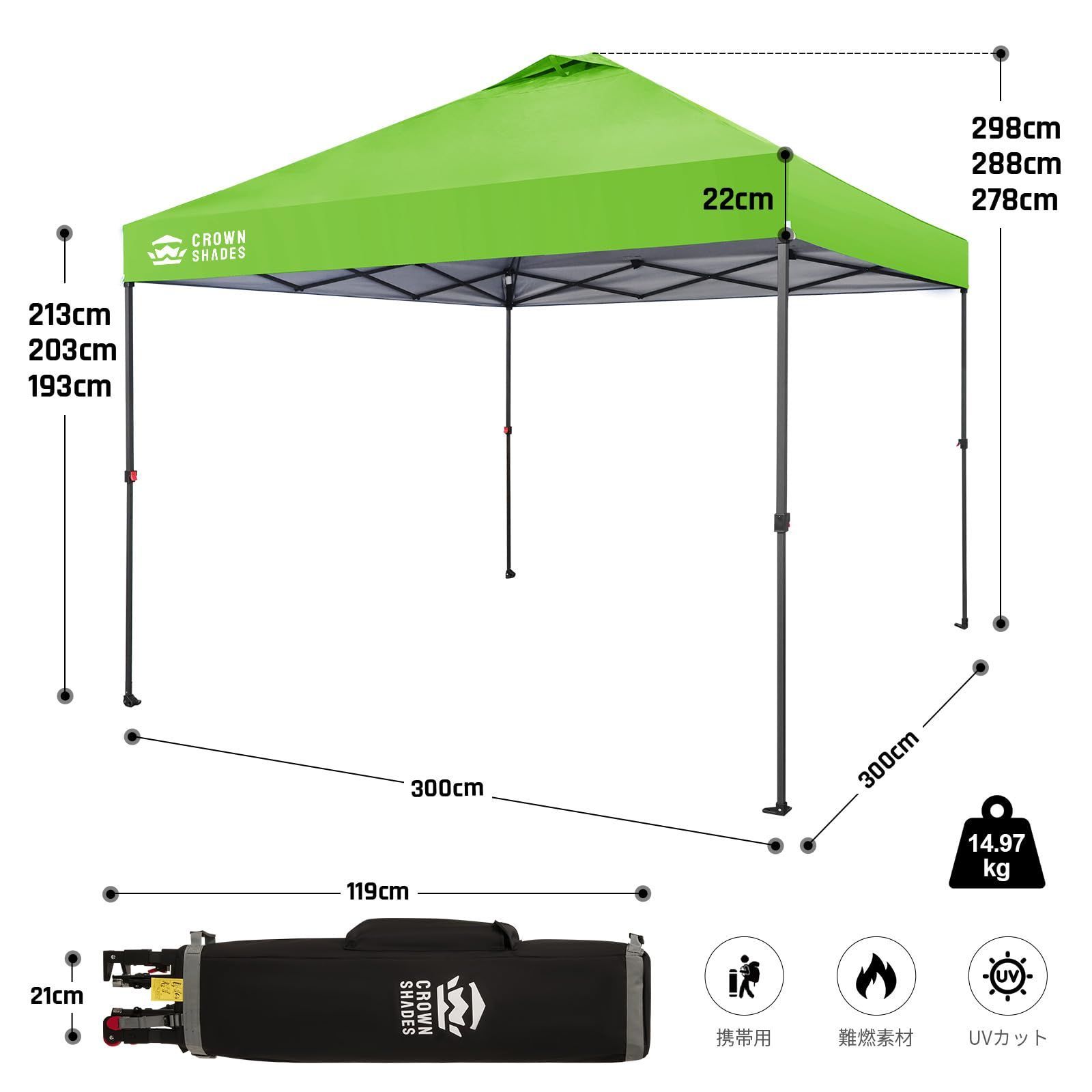 数量 庭園 公園 耐久 BBQ の収納バッグ 杭8本 ロープ4本 ウェイトバッグ センタ-ロック特許タープテント 組み立て簡単 持ち運び便利 シルバーコーティング生地 3 mx m グリーン ワンタッチタープテント SHADES CROWN