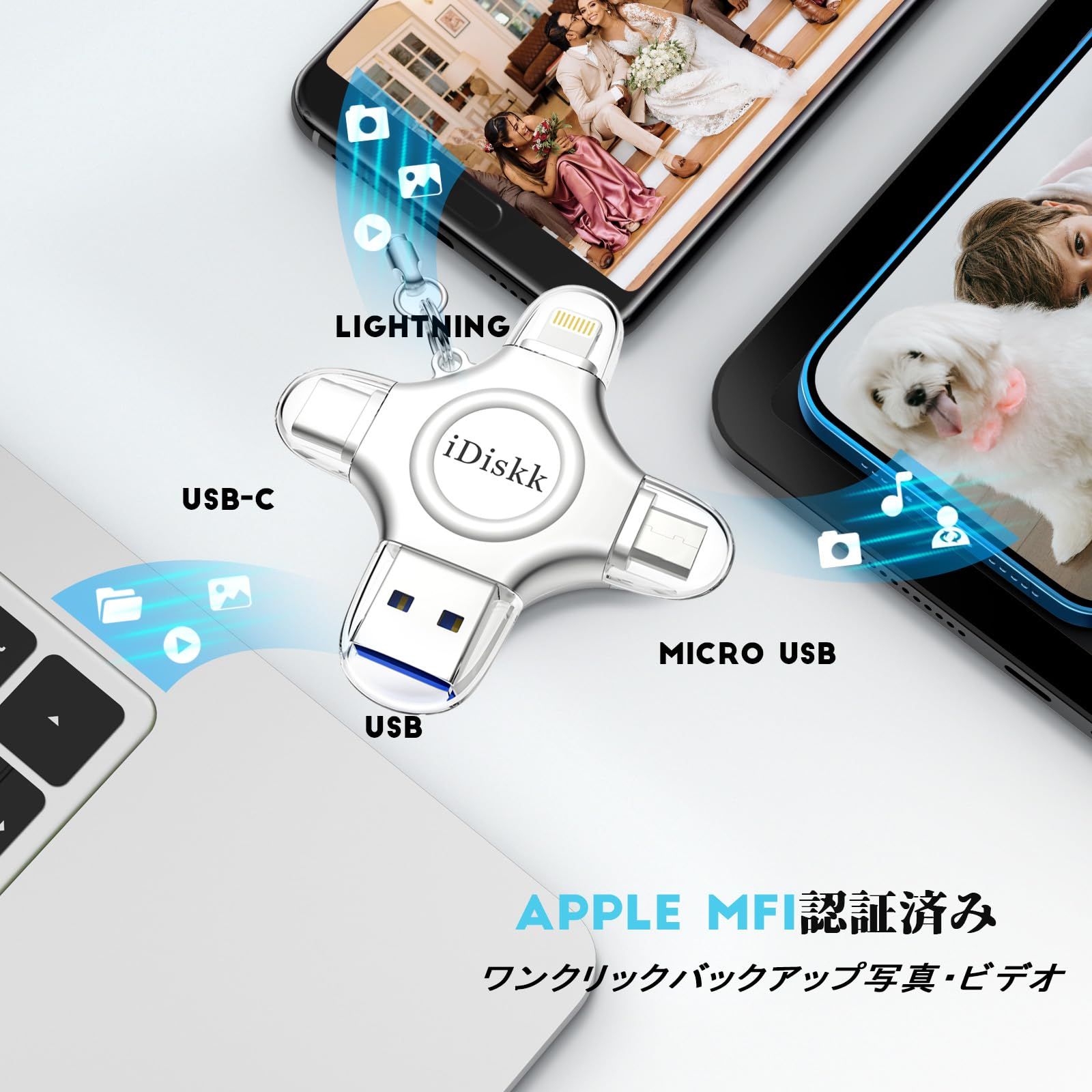 【写真の自動バックアップ・ワンクリックバックアップ】 フラッシュドライブ接続時に、ワンクリックで、IOSデバイス内の写真やビデオがバックアップ可能で、Appleデバイスのカメラロールを自動バックアップするようにiDiskkアプリで設定することができます。新しい写真・ビデオ・音楽・ドキュメントのみを自動的にバックアップされます。手動でバックアップする写真を選択する必要はありません。