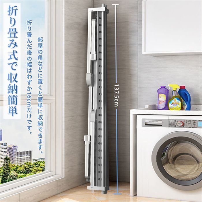 折り畳んだ後の幅はわずか16cmです。部屋の角などに置くと簡単に収納できます。使用時サイズ:(約)長さ132-230cmx高さ68.5cmx幅68cm;収納時サイズ:(約)長さ137.5cmx高12.7cmx幅13.7cm。商品の両側に伸縮式のパイプを設置しており、長さは約52cmで、横棒の間の幅は62cmです。これによって、より多くの衣類を乾かすことができ、洗濯物のほか、布団なども干せます。