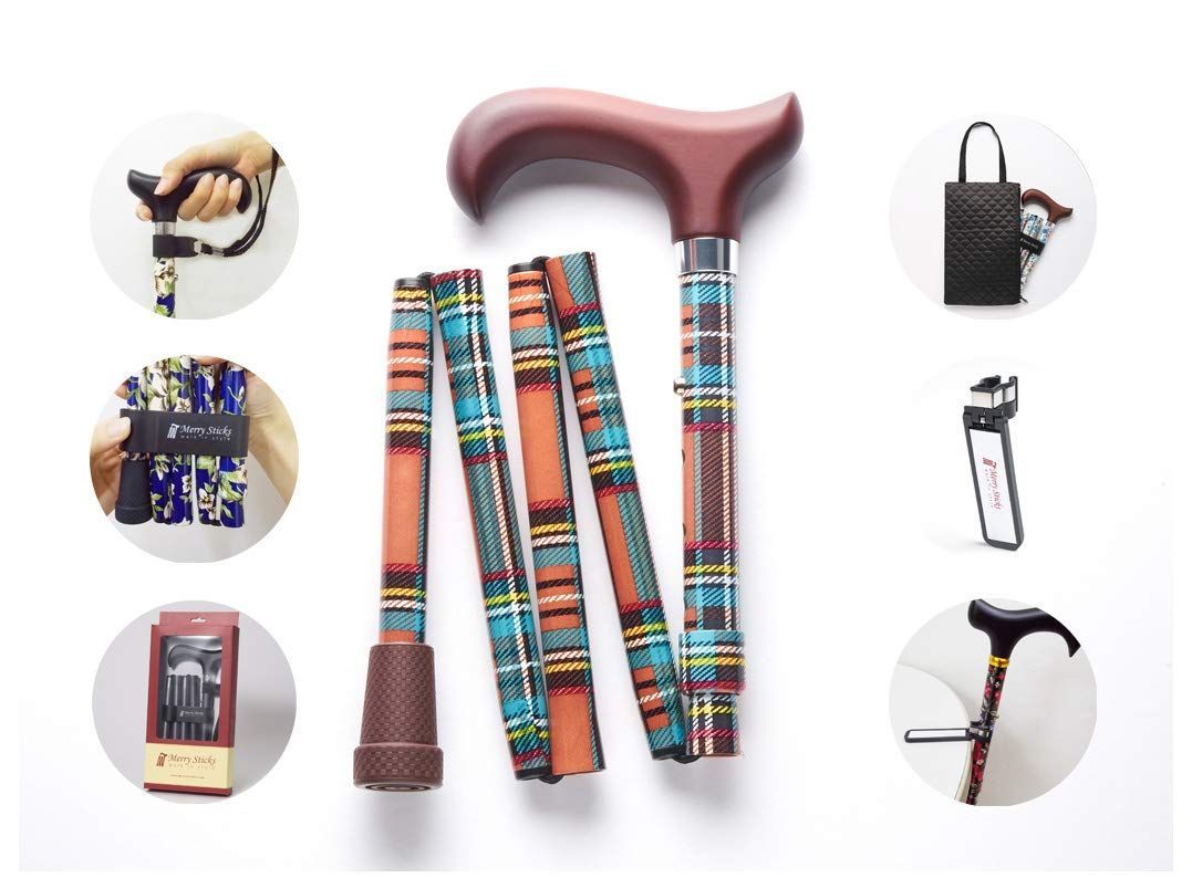 Color タータンチェック オレンジ コンボセット Merry Sticks メリースティックス 折りたたみステッキ つえぶくろ - ステッキクリップホルダー付き 杖