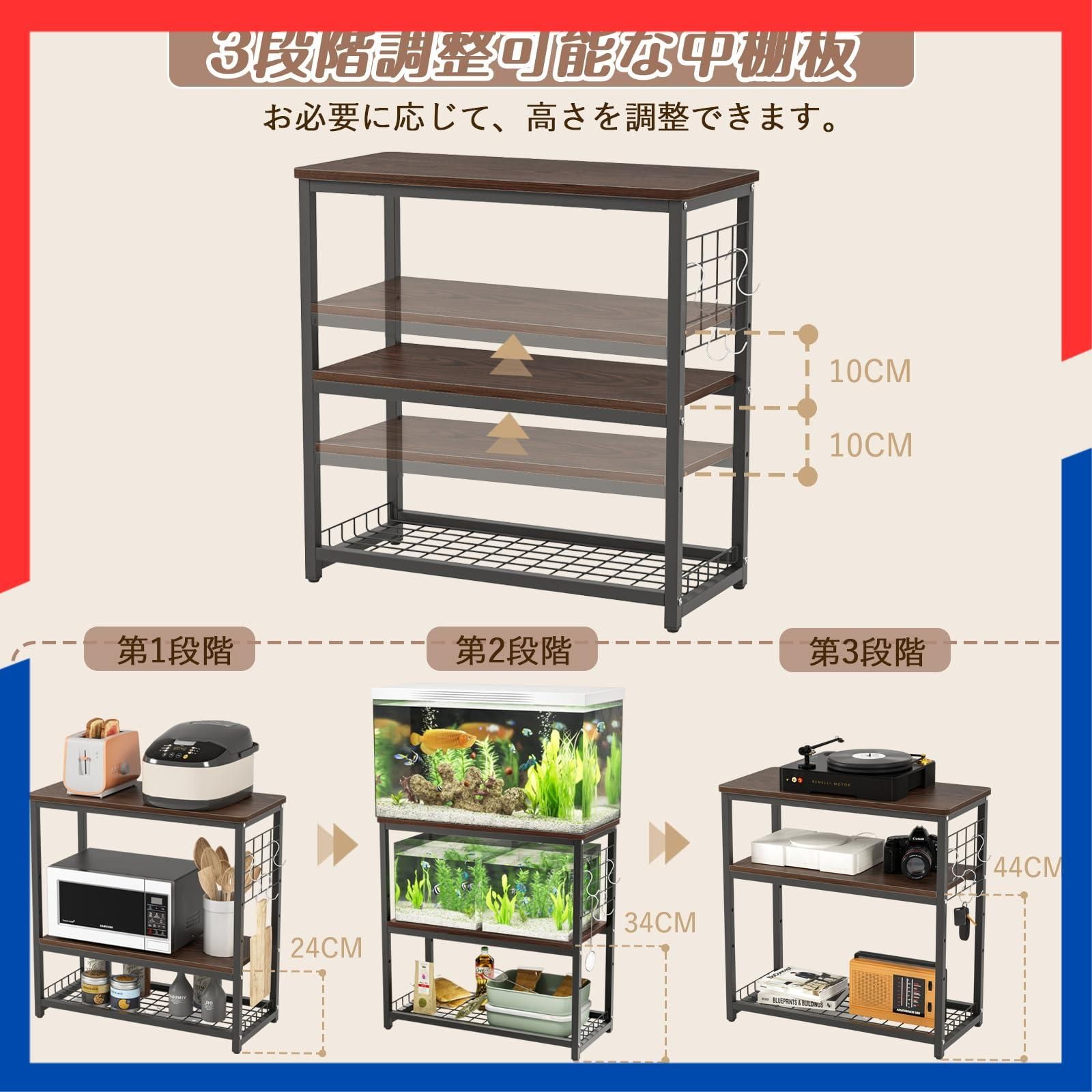 【高さ3段階調整可能な中棚】水槽スタンドの中棚の高さが3段階調節できて、用途に合わせて適当な高さを調整できます。