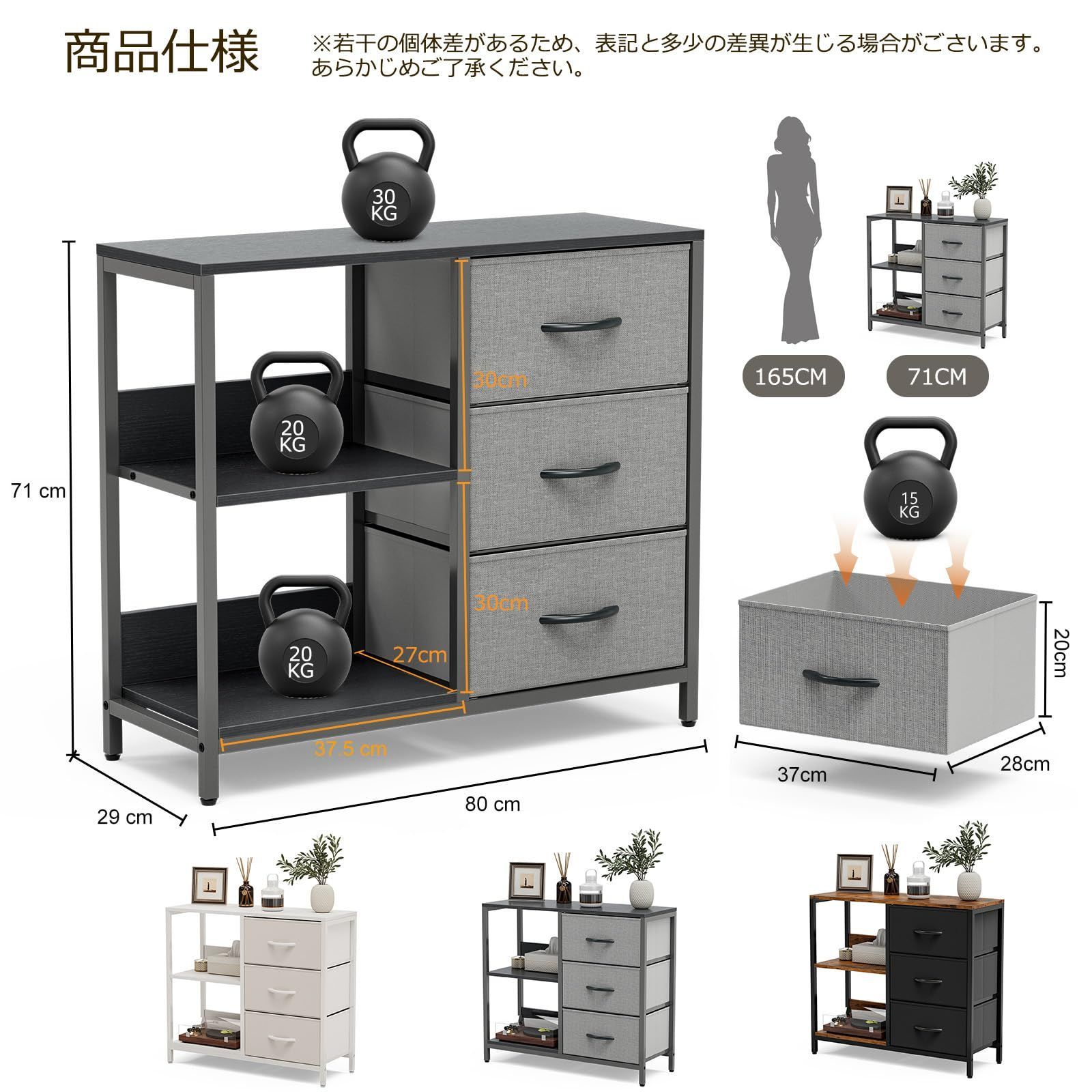 木製天板 スリム 転倒防止 省スペース コンパクト 軽量 衣類収納 組み立て簡単 収納ケース 布製引き出し 箪笥リビング収納 引き出し 3段3杯2段階棚 幅80×奥行29×高さ71 cm 布製 キャビネット リビングチェスト 洋服タンス グレー 棚付き 収