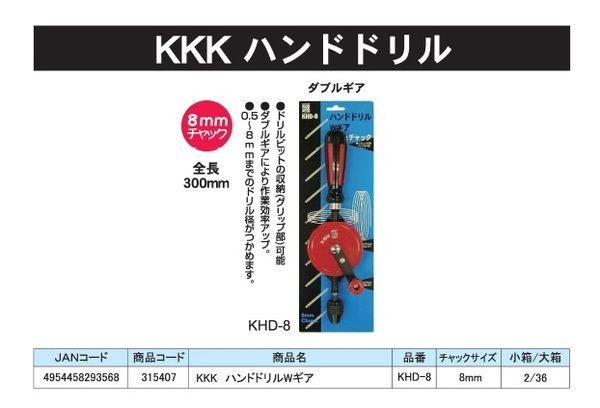 業務用 セット KKK ハンドドリル 先端工具 ダブルギア 8mmチャック 全長 300mm KHD-8 〔DIY用品 大工道具〕