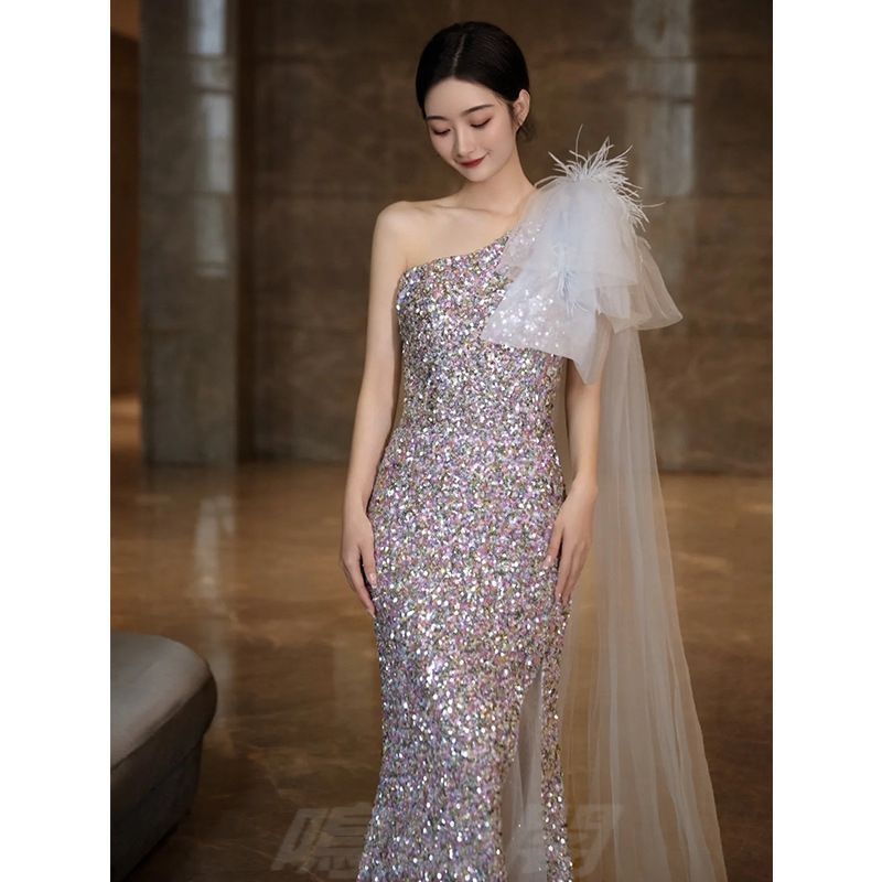 【送料無料】銀色ロングドレス 魚尾スパンコール 一字肩 ノースリーブ 高級感 結婚式 成人式 発表会 新婦 司会 学生用WP今だけ特価109