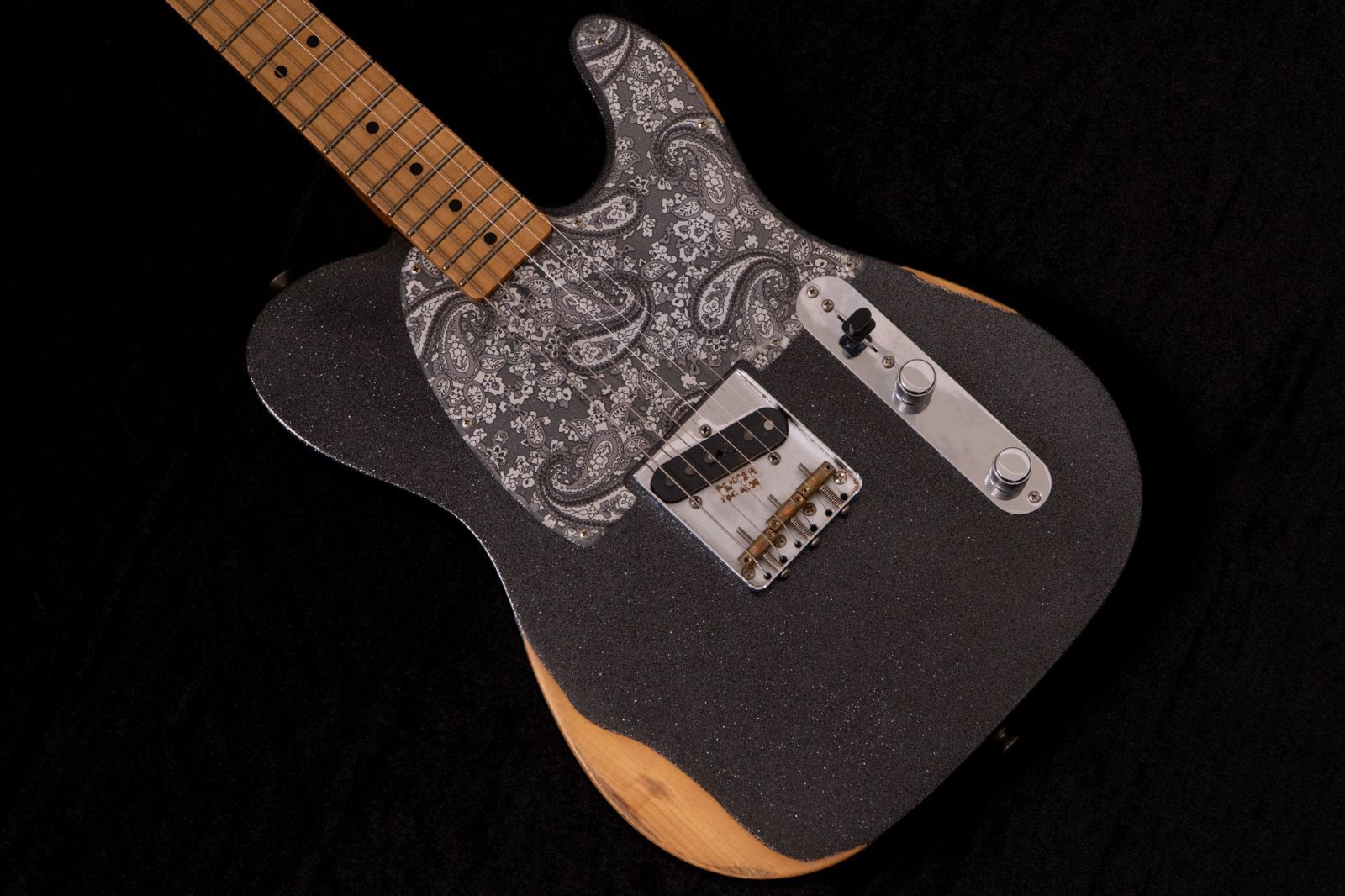 ニトロセルロースラッカーを使用したBlack Sparkleカラーでフィニッシュ、さらにペイズリー柄のピックガードを搭載し唯一無二のルックスを持ちます。