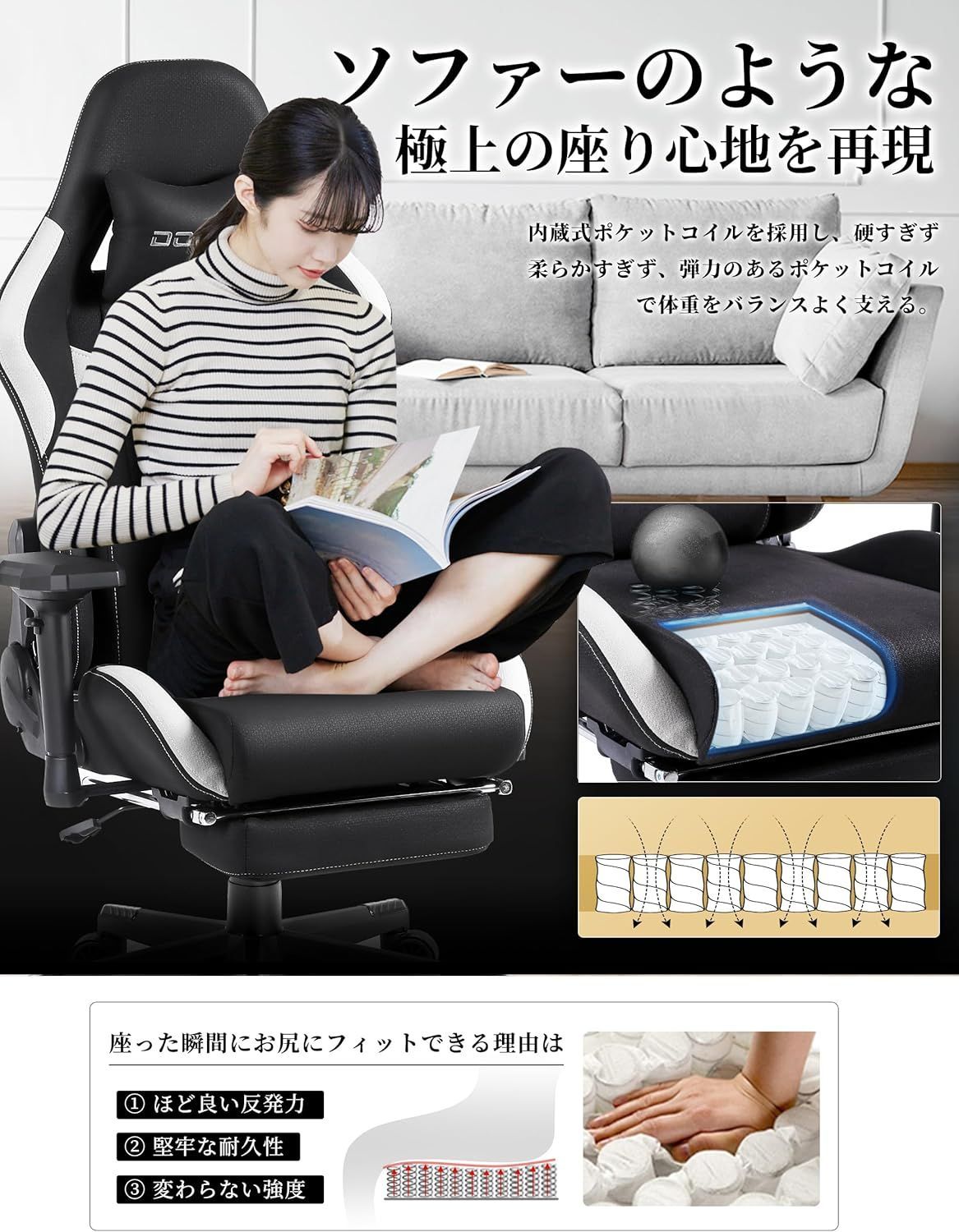 Dowinx ゲーミングチェア ファブリック オットマン付き オフィスチェア パソコンチェア 4 Dアームレスト フットレスト デスクチェア ゲーム用チェア ポケットコイル ブラック 椅子 LS-6668 B-04