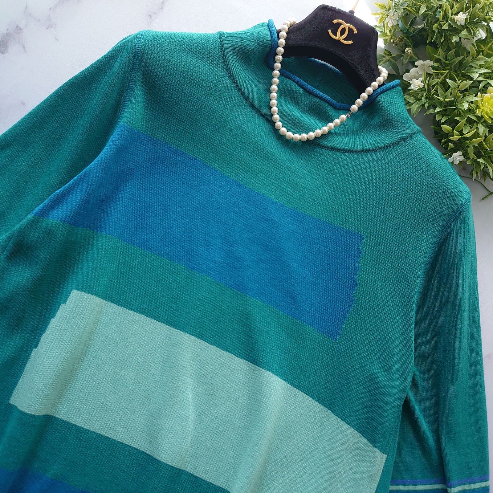 ann吉 アンキチ チュニック ニット ストレッチ 七分袖 長袖 ボーダー カットソー ブラウス フレア Aライン 緑 グリーン 青 ブルー M 38 ハイネック プルオーバー センソユニコ レディース