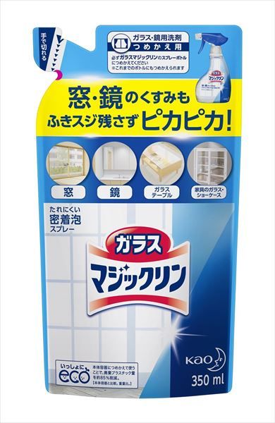 ホコリや手あかなどでくもった窓や鏡、ガラステーブル、ショーケースなどの汚れも、スッキリ落としてピカピカで透明な仕上がりに。2度ぶきなしで、ふきすじを残しません。たれにくい密着泡スプレー。