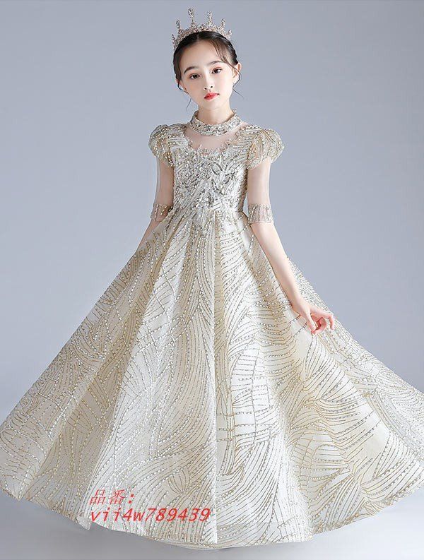 キッズドレス キラキラ ハイネック ファスナータイプ シンプル 袖あり ボリューム袖 パフスリーブ パフ袖 五分袖 ロング丈 ドレス ロングドレス ピアノ 発表会 子供ドレス パーティードレス カラードレス ワンピース プリンセス風 お姫様 上品 エレガント 女の子 ゴージャス 結婚式 子供 フォーマル かわいい 豪華 誕生日 七五三 ブライズメイド 演出 イベント 司会 写真用 大きいサイズ 110 120 130 140 150 160