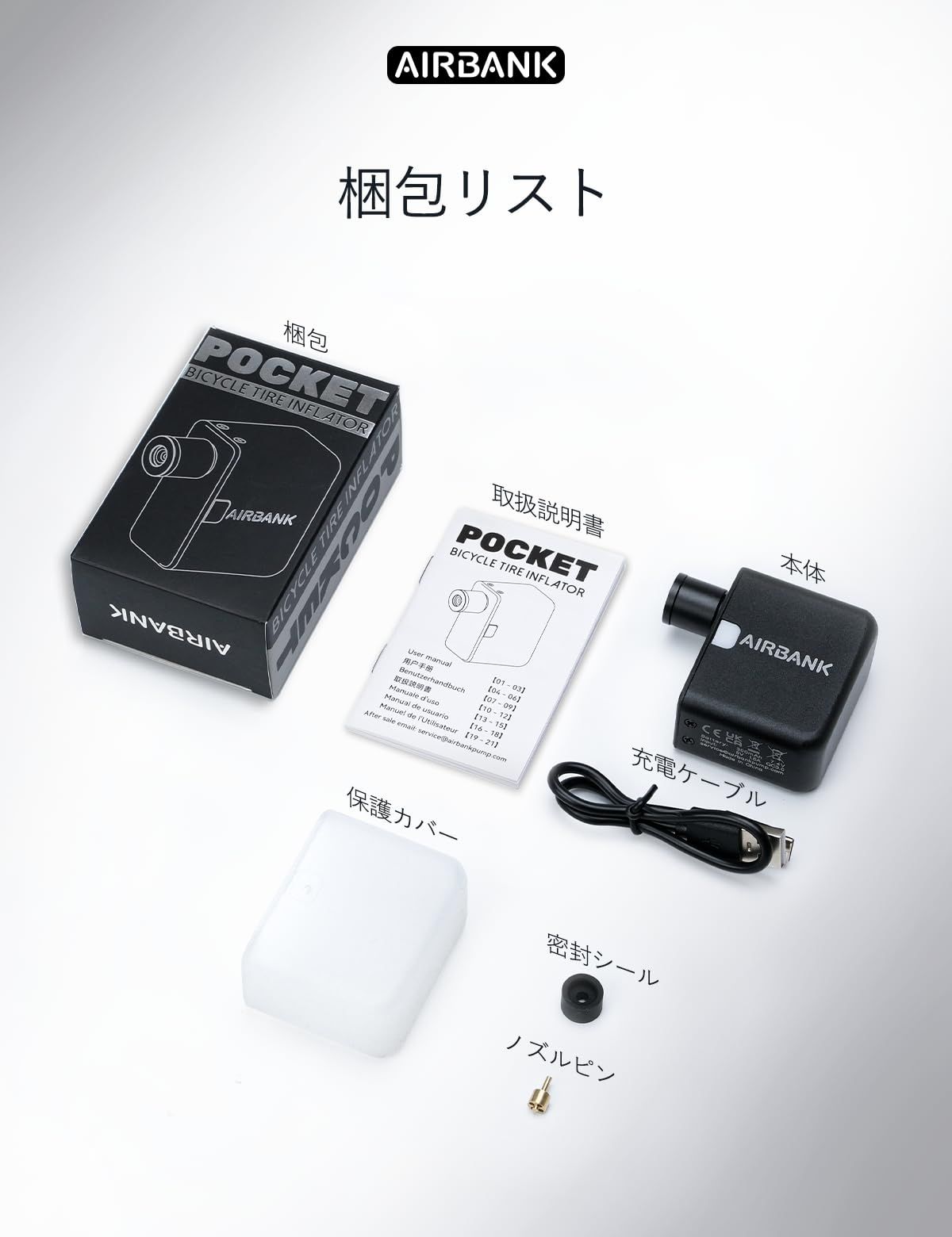 AIRBANK POCKET 自転車 空気入れ 電動ポンプ 95g軽量 小型携帯空気入れ ロードバイク 仏式米式バルブ対応