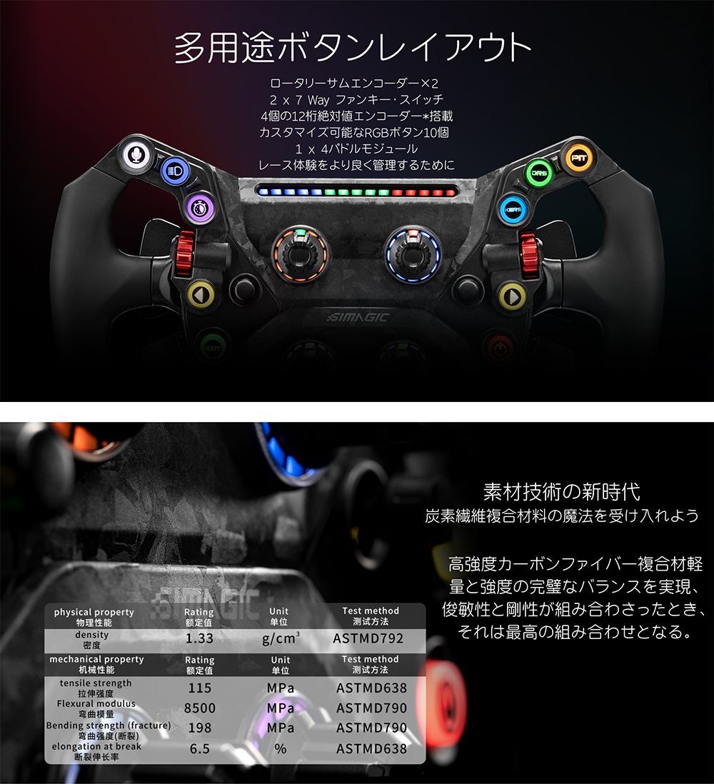 シム・レーシング・ステアリングホイールの常識を覆します。人間工学に基づいた快適なデザインで、2つのアルミニウム製サムエンコーダ、2つの7ウェイスイッチ、4つのロータリーエンコーダが正確なコントロールを可能にします。10個のRGBボタンでセットアップをカスタマイズ。カーボンファイバーコンポジット製で、軽量かつ頑丈。Simagic GT Neoであなたのレーシングエクスペリエンスを向上させましょう。