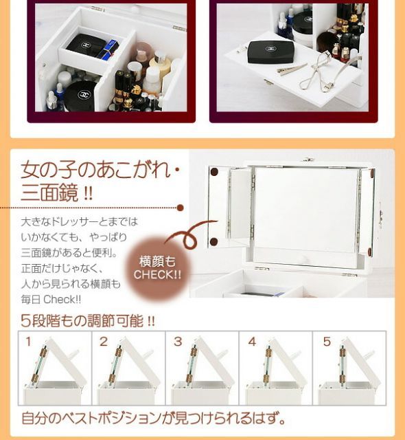 口紅、マスカラ、、使いやすい角度で使えるから、おもしろいくらいメイクがキマル♪ミラーは大型だから、顔全体が映りこんで見落としなしの失敗知らず♪三面鏡になっているから横顔もチェックできて、勝負メイクだって完璧♪さらに、前板は倒してテーブルとして使用できる♪至れり尽くせりの設計!